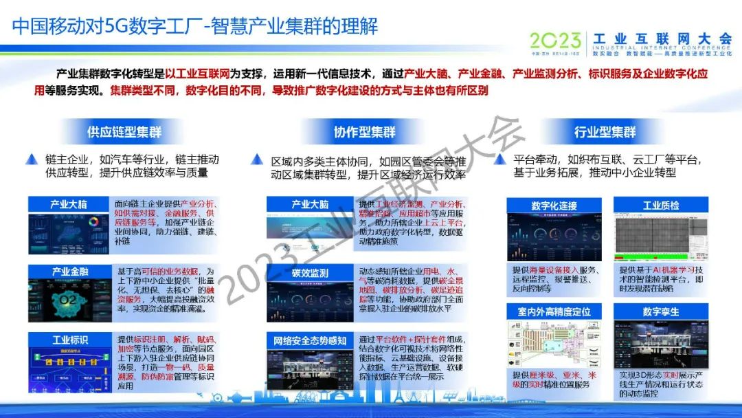 陳豫蓉表示,中國移動組建軍團推動5G數字工廠的建設,提供“頂設規劃-解決方案-標準產品”全棧服務,支撐解決方案“融云網、融平臺、融應用”一體化部署。她介紹到,產業集群數字化轉型是以工業互聯網為支撐,運用新一代信息技術,通過產業大腦、產業金融、產業監測分析、標識服務及企業數字化應用等服務實現。集群類型不同,數字化目的不同,導致推廣數字化建設的方式與主體也有所區別。