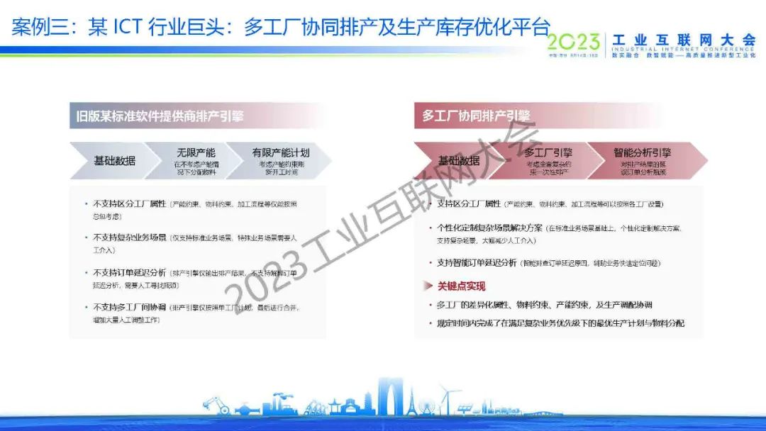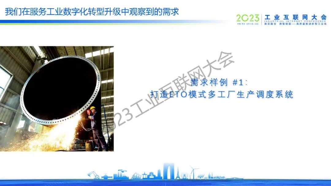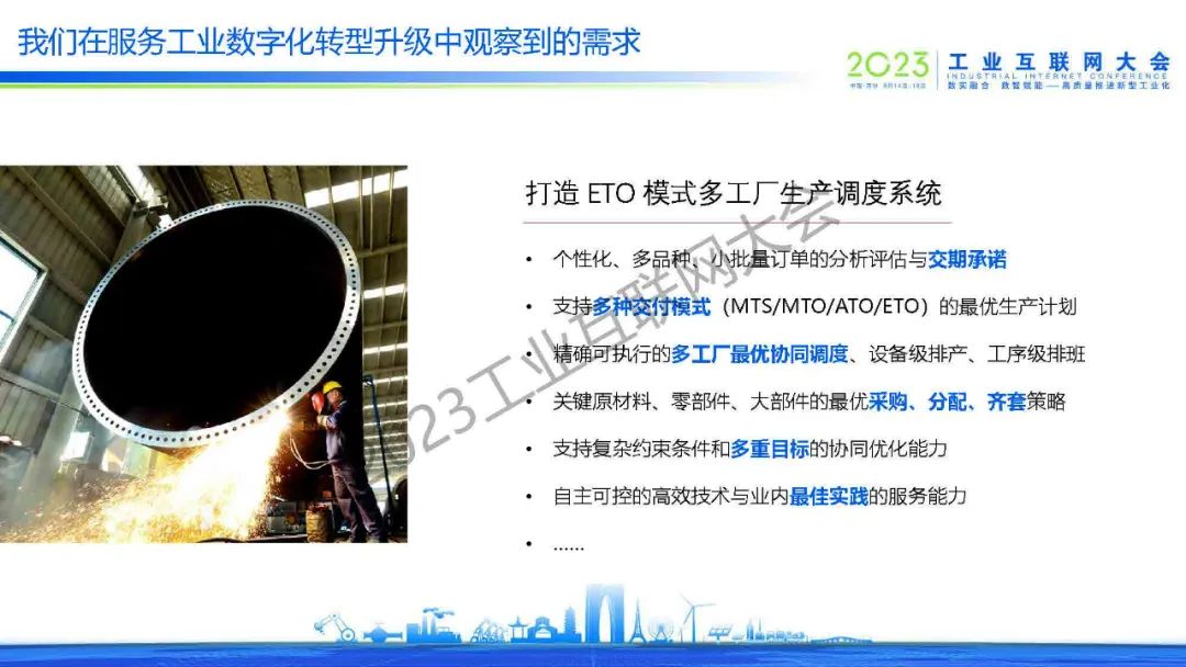 “裝備制造企業(yè)的數(shù)字化轉型就是打造 ETO 模式多工廠生產調度系統(tǒng)。它涵蓋了很多信息的抽象性需求描述,可能包括多品種,小批量訂單的交期承諾,可能包括個性化、多品種、小批量訂單的分析評估與交期承諾、支持多種交付模式(MTS/MTO/ATO/ETO)的最優(yōu)生產計劃、精確可執(zhí)行的多工廠最優(yōu)協(xié)同調度、設備級排產、工序級排班等。“