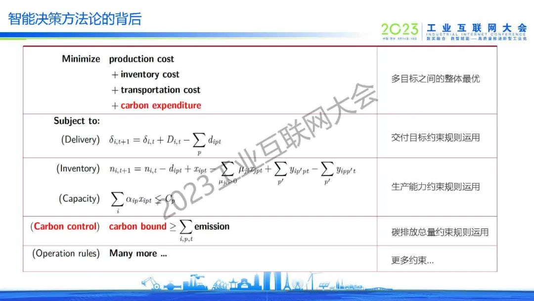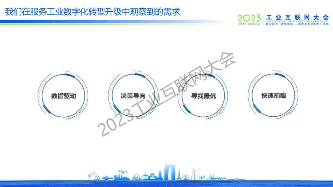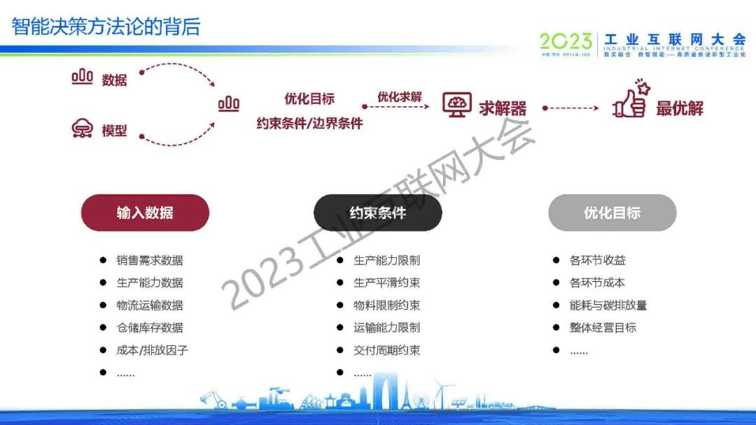 王曦分享了裝備、化工和耐用消費品的三個需求樣例,提出了在服務工業(yè)數(shù)字化轉型升級中觀察到的四大需求:數(shù)據(jù)驅動、決策導向、尋找最優(yōu)和快速前瞻。智能決策方法論是通過輸入數(shù)據(jù)和模型,在優(yōu)化目標和約束條件(邊界條件)下優(yōu)化求解出最優(yōu)解。