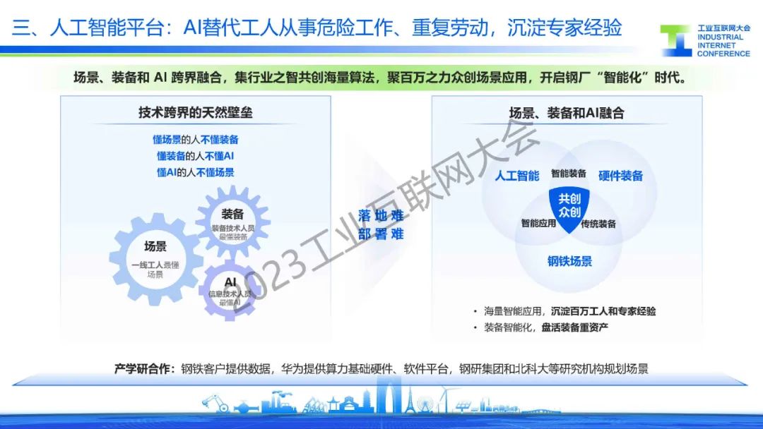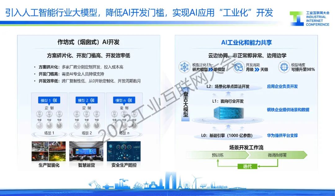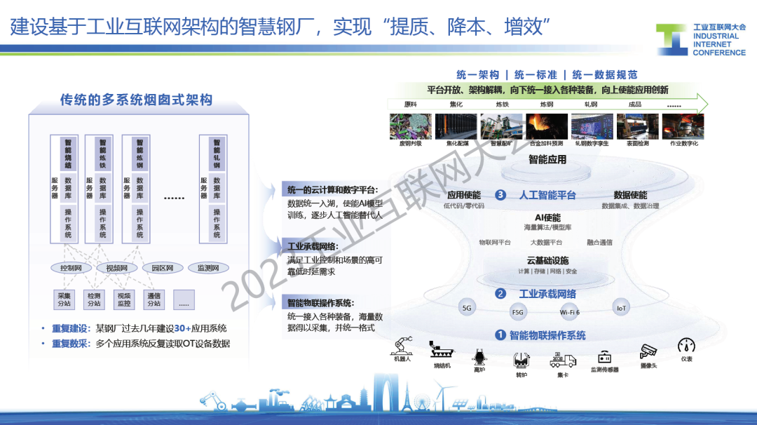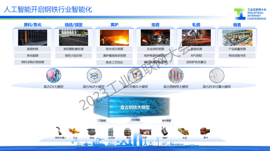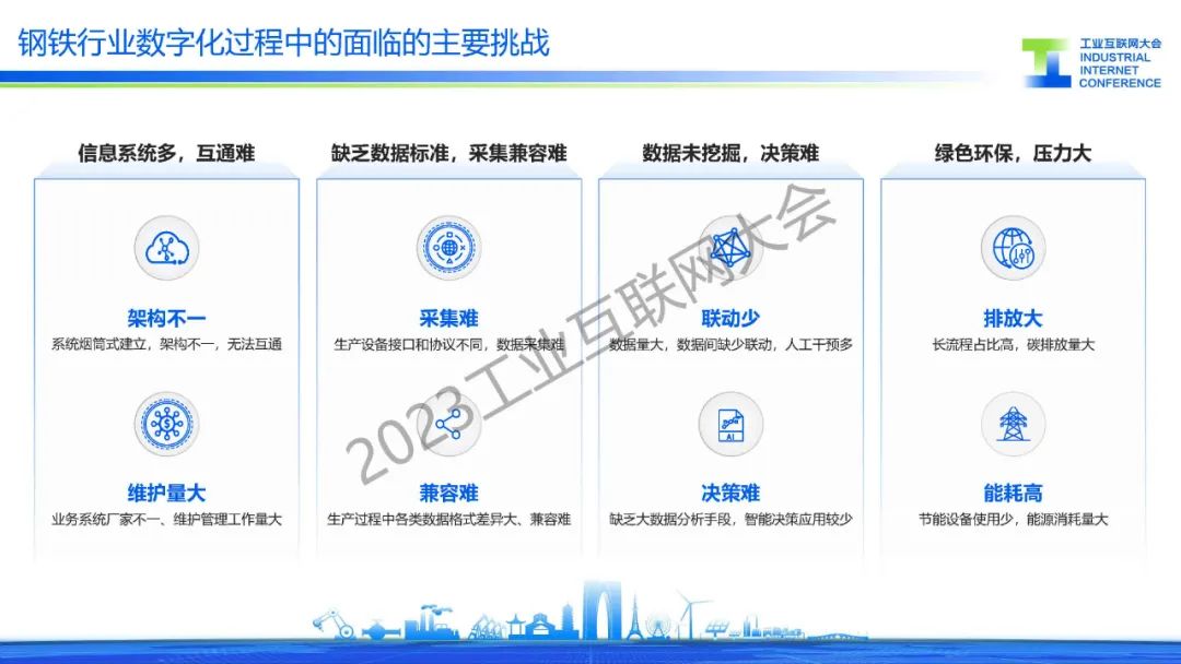 胡罡介紹,鋼鐵行業(yè)處在數(shù)字化轉(zhuǎn)型的爆發(fā)期,智能化應用不斷涌現(xiàn),在這過程中還面臨著信息系統(tǒng)、數(shù)據(jù)標準和環(huán)保等主要挑戰(zhàn)。目前,通過建設(shè)基于工業(yè)互聯(lián)網(wǎng)架構(gòu)的智慧鋼廠,來實現(xiàn)”提質(zhì)、降本、增效“的目標,同時引入人工智能行業(yè)大模型,降低AI開發(fā)門檻,實現(xiàn)AI應用“工業(yè)化”開發(fā),開啟鋼鐵行業(yè)智能化。
