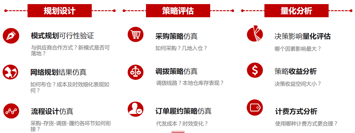 數(shù)字孿生供應(yīng)鏈仿真平臺的核心能力主要分為三大方面,包括針對供應(yīng)鏈的規(guī)劃設(shè)計、不同環(huán)節(jié)的策略評估、以及相應(yīng)的量化分析,三大能力相互連接,由廣泛到精細。在規(guī)劃設(shè)計方面,主要涉及模式選擇、網(wǎng)絡(luò)規(guī)劃、倉網(wǎng)部署、全流程銜接的仿真等;在策略評估方面,包括各個供應(yīng)鏈環(huán)節(jié)的策略的仿真模擬,用于指導(dǎo)供應(yīng)鏈的計劃與執(zhí)行;在量化分析方面,能夠?qū)Σ煌h(huán)節(jié)的決策因子進行分析,衡量策略的收益等。