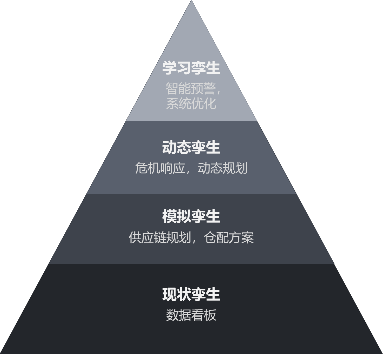 根據(jù)業(yè)務(wù)需求、能力差異、技術(shù)水平等方面,可以將數(shù)字孿生供應(yīng)鏈仿真平臺分為四個階段,從下往上依次是現(xiàn)狀孿生、模擬孿生、動態(tài)孿生、學(xué)習(xí)孿生。