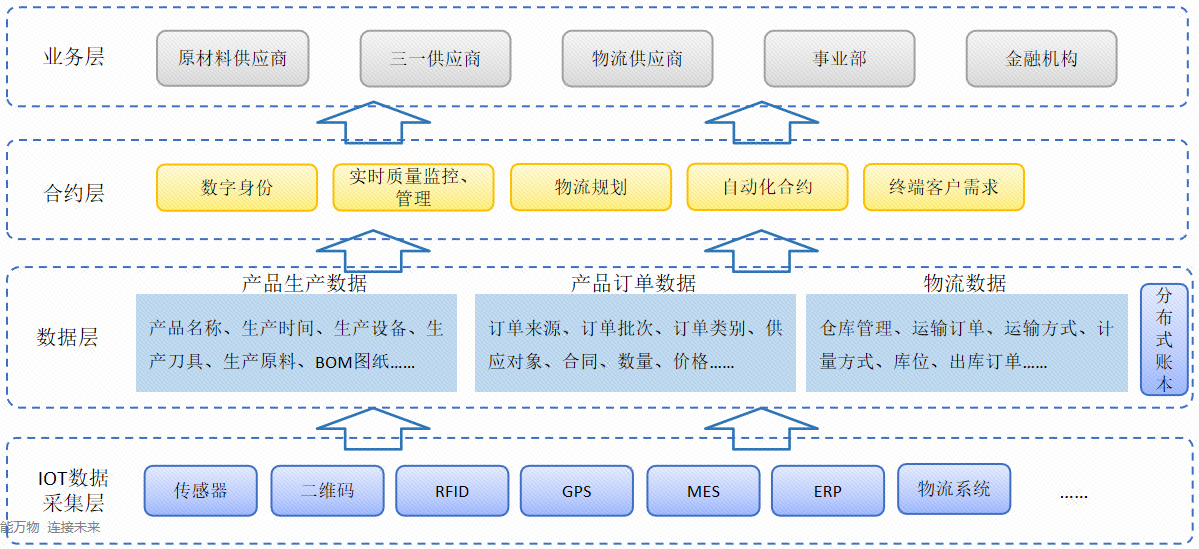 通過三一數字化供應鏈的質量管控中心,基于區塊鏈技術實現了包括業務層、合約層、數據層以及IOT數據采集層四個層面,構建了一個確保信息共享和產品質量控制的供應鏈系統。