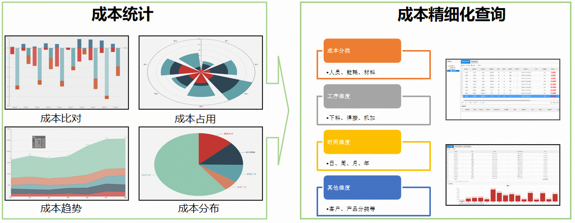 同時,成本管控中心還支持以生產過程采集數據為基礎進行成本統計,也支持多種維度結合的成本精細化查詢,如工序、時間、產品分類等。