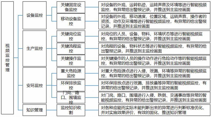 對現場指定位置進行智能視頻監控,有異常彈出畫面警報提醒,確保現場異常的及時發現。它通過對生產現場關鍵設備、移動設備,關鍵的崗位、流程和操作,重大的危險源、環保排放、門崗、路口和圍墻進行視頻監控,對異常情況進行智能判斷、報警記錄,同時推送到主監控畫面,并進行知識收割,實現與HSE、生產、設備、能源、物流和知識管理的協同。