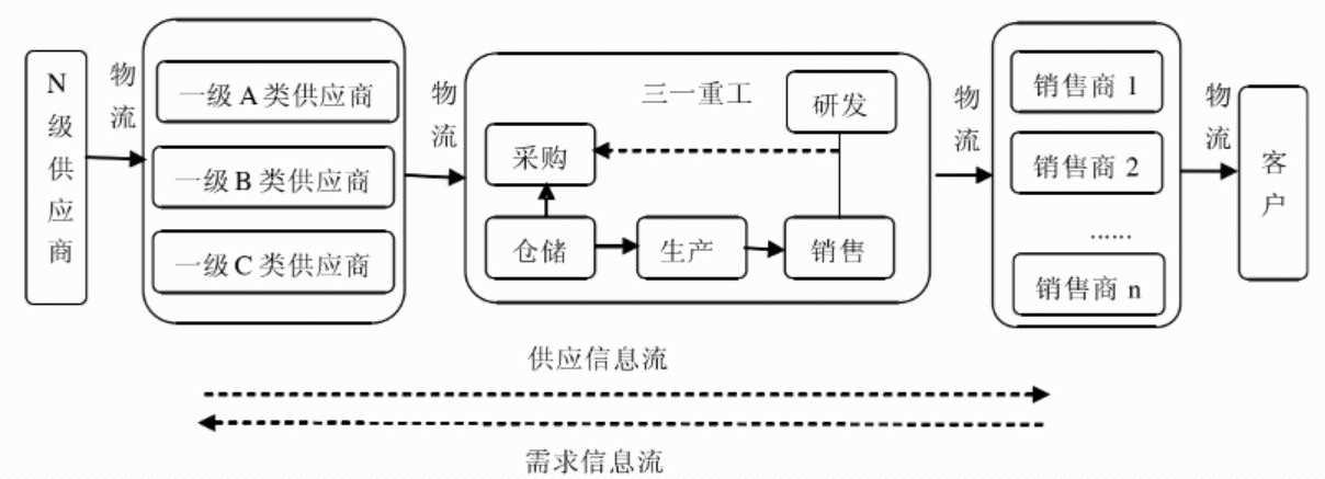 三一數字化產業鏈以訂單為基礎,以訂單全生命為周期,以訂單執行過程中產生的“供應鏈業務流”為主線,進行過程—成本—資金精細化、服務個性化、的服務支撐。三一數字化供應鏈的建設分三期,該建設將完善原有管控模式、業務流程、質量保障等,通過業務協同將供應鏈上下游的生產物資需求計劃信息;物資的招標采購、供應、點收信息等物貿核心業務分析信息融合貫通、形成具有獨特價值的供應鏈數字化集成服務,實現對企業的定位和要求。系統的建設不但滿足當前業務運行及管理需求,同時能適應業務模式的變化及個別供應商定制服務的需求,發掘服務價值鏈,以供應鏈協同帶動企業面向工程項目的服務轉型。同時,提升企業數據資產的管理水平,為決策支持的數據基礎建立數據倉庫。
