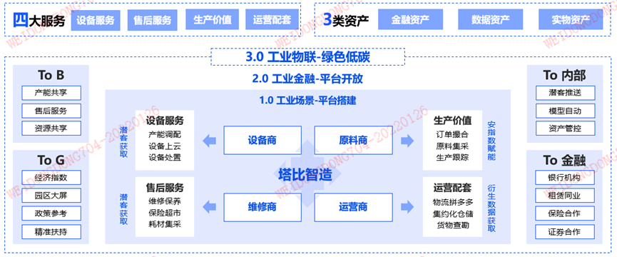 基于對中小微制造企業(yè)的熟悉,“塔比智造”平臺橫向以中小微企業(yè)成長過程為線索,覆蓋其產(chǎn)業(yè)升級、規(guī)模擴張中的固定資產(chǎn)新增需求以及營運資金配套需求;縱向以設(shè)備生命周期為線索,覆蓋設(shè)備采購、使用、轉(zhuǎn)讓等每個環(huán)節(jié)衍生出的企業(yè)經(jīng)營管理需求,最終形成以設(shè)備為載體、以“塔比智造”平臺為依托,協(xié)同金融機構(gòu),解決中小微制造企業(yè)在每一次交易、使用、處置環(huán)節(jié)中的管理需求及融資需求,完成產(chǎn)業(yè)生態(tài)閉環(huán)。