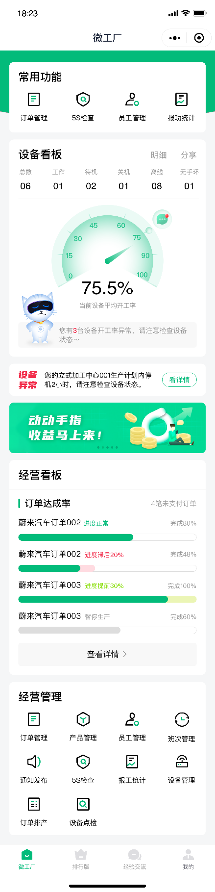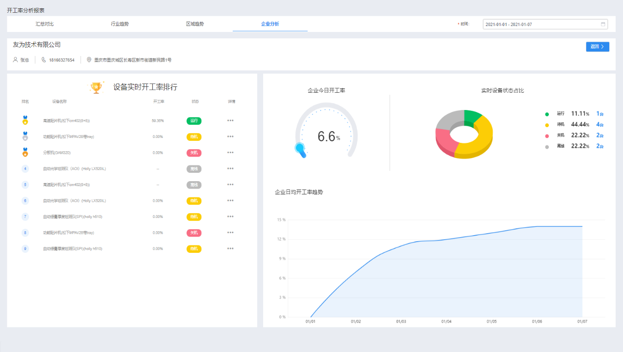 工廠整體設(shè)備開工率看板可主動推送當前設(shè)備的開工率及健康狀況,以紅亮箱包公司管理者為代表的中小微制造業(yè)企業(yè)主,可及時遠程了解工廠實際開工表現(xiàn),從而可以更有目標性地進行產(chǎn)能優(yōu)化,提高設(shè)備整體利用率。