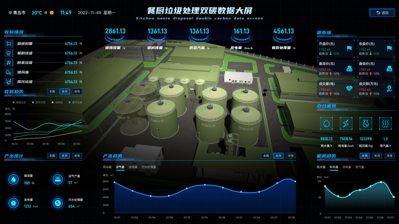 利用數字技術賦能垃圾處置廠降碳解決方案案例應用于杭州市富陽區循環經濟產業園餐廚垃圾處置項目。項目位于杭州市富陽區,設計規模日處理300噸餐廚/廚余垃圾,項目資源化利用后,年發電量700萬度、年產工業油脂3000噸,可實現項目減量化、無害化、資源化處置,是浙江省的重點示范項目。該項目工程于20205月開工建設,202012月餐廚垃圾車進場卸料,歷時7個月,實現了可視化、智能化、平臺化的運營管理,用實際行動響應杭州提出的打造全國數字經濟第一城的號召。