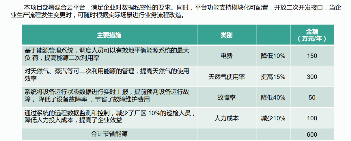 降本增效綜合實施效益顯著。一是節省能源成本。基于能源管理系統,調度人員可以有效地平衡能源系統的最大負荷,一年電費支出降低10%二是提高能源二次利用率。對天然氣、蒸汽等可二次利用能源的管理,提高天然氣的使用效率15%三是降低設備故障率。系統將設備運行狀態數據進行實時上報,提前預判設備運行故障,降低設備故障率40%四是減少人力投入,通過系統的遠程數據監測和控制,可減少廠區10%的巡檢人員。
