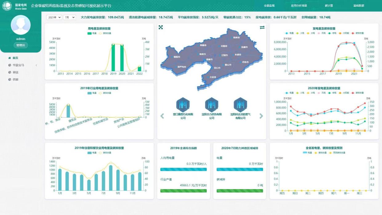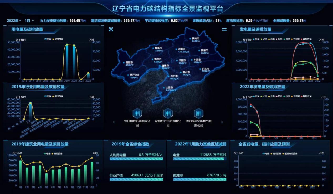 國家發展和改革委員會應對氣候變化司組織國家應對氣候變化戰略研究和國際合作中心研究確定了中國區域電網的平均二氧化碳排放因子。平臺基于遼寧省電碳熱力圖,火力發電碳排放量、平均碳排放強度等20項電碳指標,通過清潔能源占比、碳排放量增量、碳排放速率變化量、外送電量增量、清潔能源消納程度等5個維度,構建區域“雙碳”綜合指數。通過“雙碳”綜合指數的開發,可以更全面的度量區域碳排放的實際情況,增加了碳排放管理的科學工具。在“雙碳”綜合指數的應用上,如何支持政府在產業調整、新上項目、創新發展等方面的具體決策,科學指導政府規劃計劃和實際工作落地實施,是輔助城市政府推進“雙碳”工作的重點。