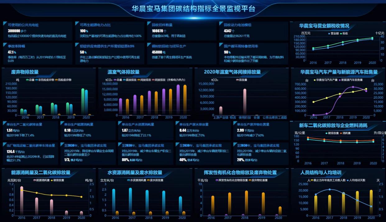 寶馬集團作為中德(沈陽)高端制造產業園規模較大的企業,是我省先進制造企業的典范,具有較強的代表性。平臺通過匯集寶馬運營、企業應用(華晨寶馬集團)供應鏈相關數據,以及車輛使用等碳排放相關關鍵績效指標,深度剖析華晨寶馬全產業鏈碳指標數據,利用可視化技術實現碳排放多維度全景監測。通過汽車生產過程中主要資源消耗和排放量的匯總統計與對比分析,監測企業的能源消耗結構特點和變化趨勢,為企業制定降碳增效方案、進一步實現節能減排、提高綠色發展水平提供數據支撐。具體內容如下: