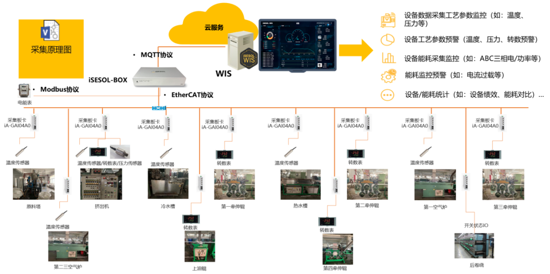 面向場景:工廠數(shù)字化制造運營系統(tǒng)首先將新華膠絲廠的生產設備聯(lián)網,設備運行數(shù)據采集及相關工段設備的能耗數(shù)據采集,解決設備運行數(shù)據孤島問題,實時掌握設備運行工藝參數(shù)、對工藝參數(shù)進行監(jiān)控預警,保證產品生產質量,實時掌握設備能耗情況及全廠各部門能耗情況、對全廠各部門的能耗進行監(jiān)控管理及統(tǒng)計分析。通過電子看板、統(tǒng)計報表、統(tǒng)計圖表等多樣的數(shù)據呈現(xiàn)方式,可實時掌握設備運行、訂單完成、產品質量、料耗、設備能耗、人員績效等情況,為企業(yè)生產管理決策提供實時有效的數(shù)據支撐。