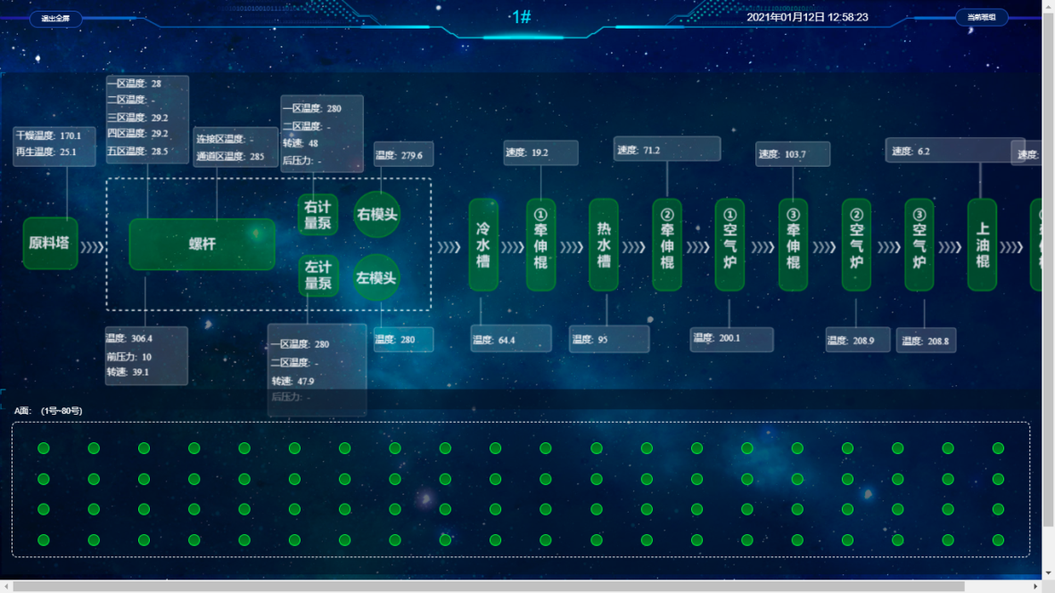 第一,打造了新華膠絲廠能源數(shù)字工廠。通過能耗在線監(jiān)測系統(tǒng)實現(xiàn)對新華膠絲廠生產過程中能源消耗進行監(jiān)測和生產批次管理數(shù)據對接,實時顯示新華膠絲廠4條生產線能耗、單耗等數(shù)據,組態(tài)化大屏形式展示關注的能源指標,實現(xiàn)獨立靈活自適配,符合各種生產實際場景需求。任意關鍵數(shù)據指標適配;豐富圖表、設備組件;配置靈活,即時生效,靈活調整;實時業(yè)務指標、視頻監(jiān)控融合。