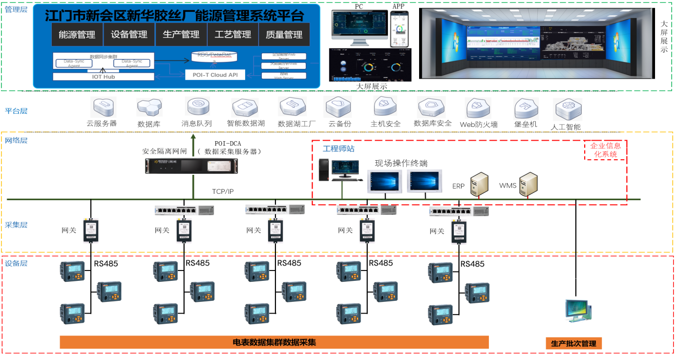 面向場景:打造了一套新華膠絲廠能耗在線監(jiān)測管理系統(tǒng)平臺,具備與ERP等上層信息系統(tǒng),以及一期項目的工廠數(shù)字化制造運營系統(tǒng)、現(xiàn)場儀器儀表、設備的集成能力,并將這些實時數(shù)據存入本地MySQL數(shù)據庫,為未來企業(yè)發(fā)展新系統(tǒng)的集成,打下穩(wěn)定、擴展性的基礎。