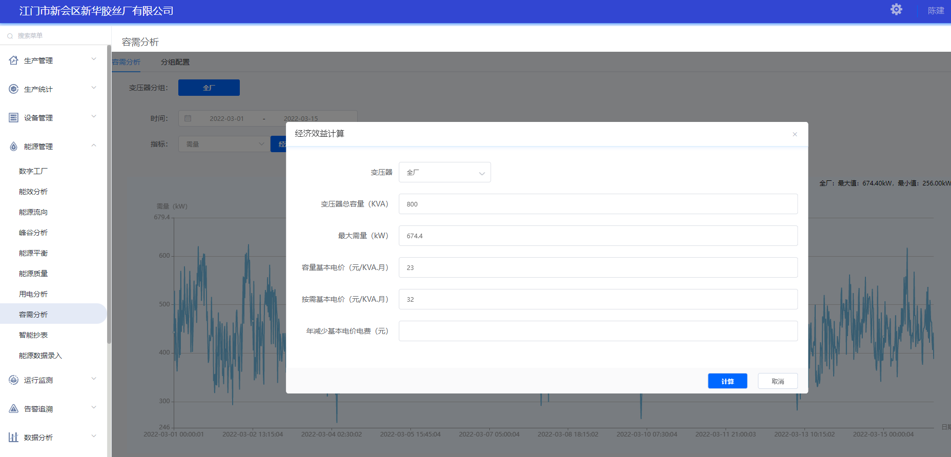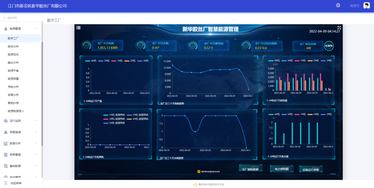 第二,實現(xiàn)能源精細化管理。能源管理模塊是實現(xiàn)能源精細化管理的重要途徑,能夠實時反映新華膠絲廠能效水平,是深入挖掘節(jié)能潛力的重要抓手。通過對能源消耗過程信息化、可視化管理,優(yōu)化生產工藝用能過程,科學、合理地制定企業(yè)能耗考核標準和考核體系,有效提升新華膠絲廠能源管理水平。能源管理包括能源看板、報表統(tǒng)計、能源流向、能效分析、峰谷分析。
