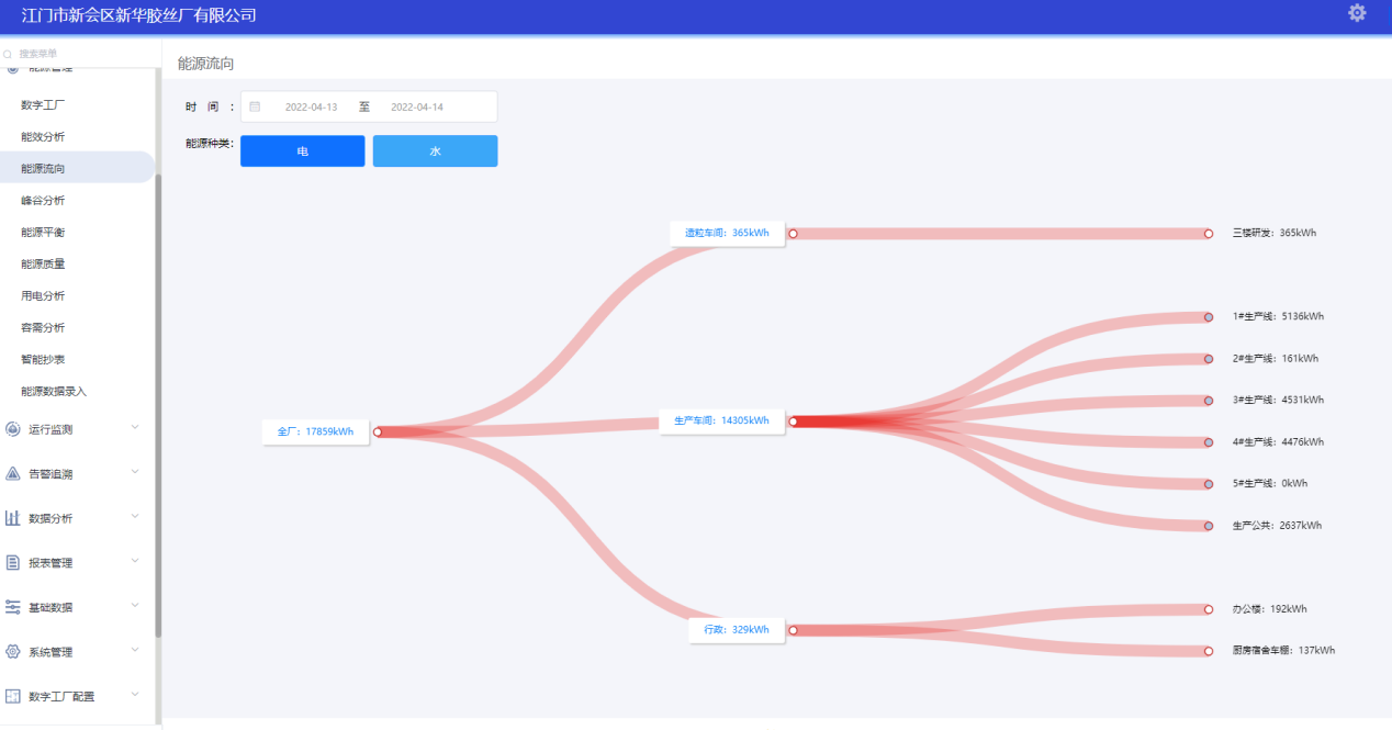 新華膠絲廠生產能源流向動態(tài)監(jiān)測(全廠→生產車間→生產線→重點耗能設備等);通過能源流向圖,可以查看能源消耗的去向,也可以查看不同區(qū)域能源利用比例情況。該能流圖能夠實時顯示生產過程中不同能源的消耗數(shù)據。