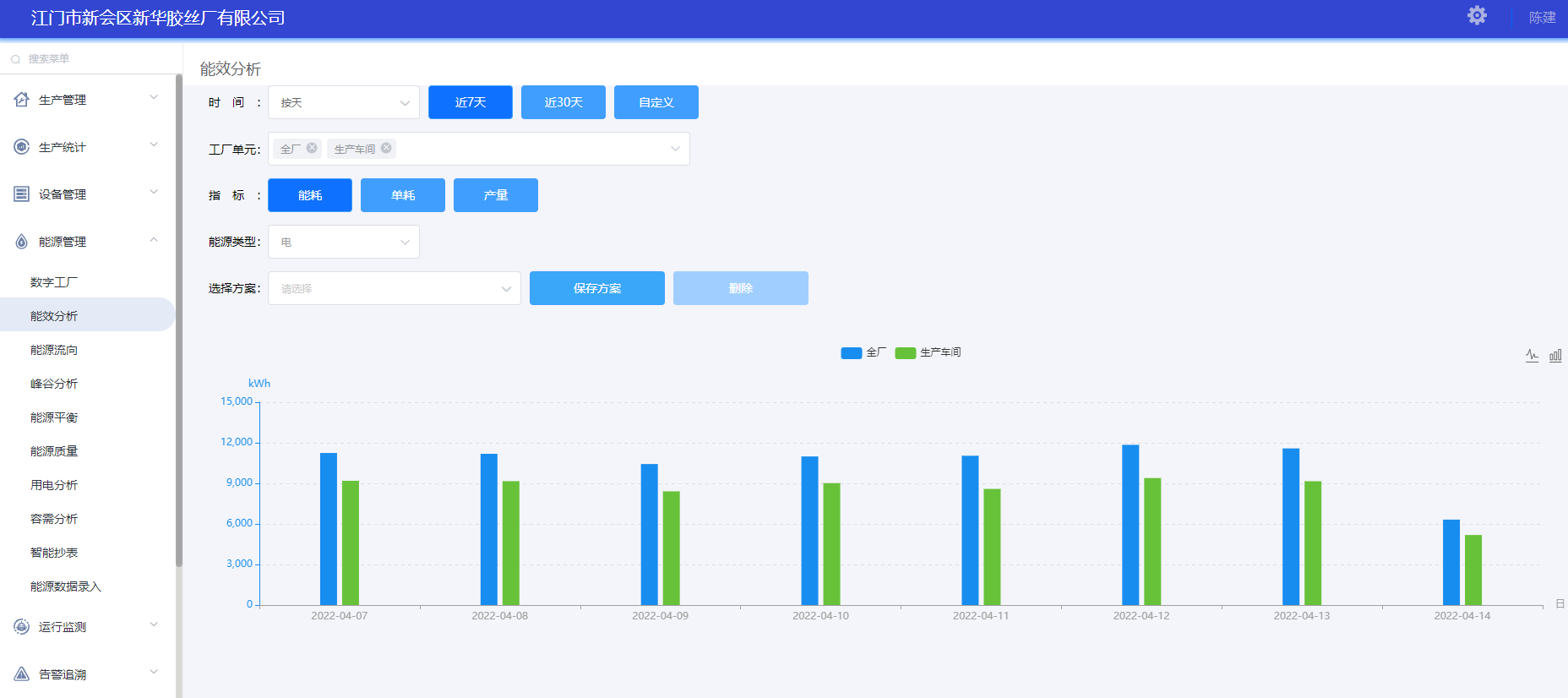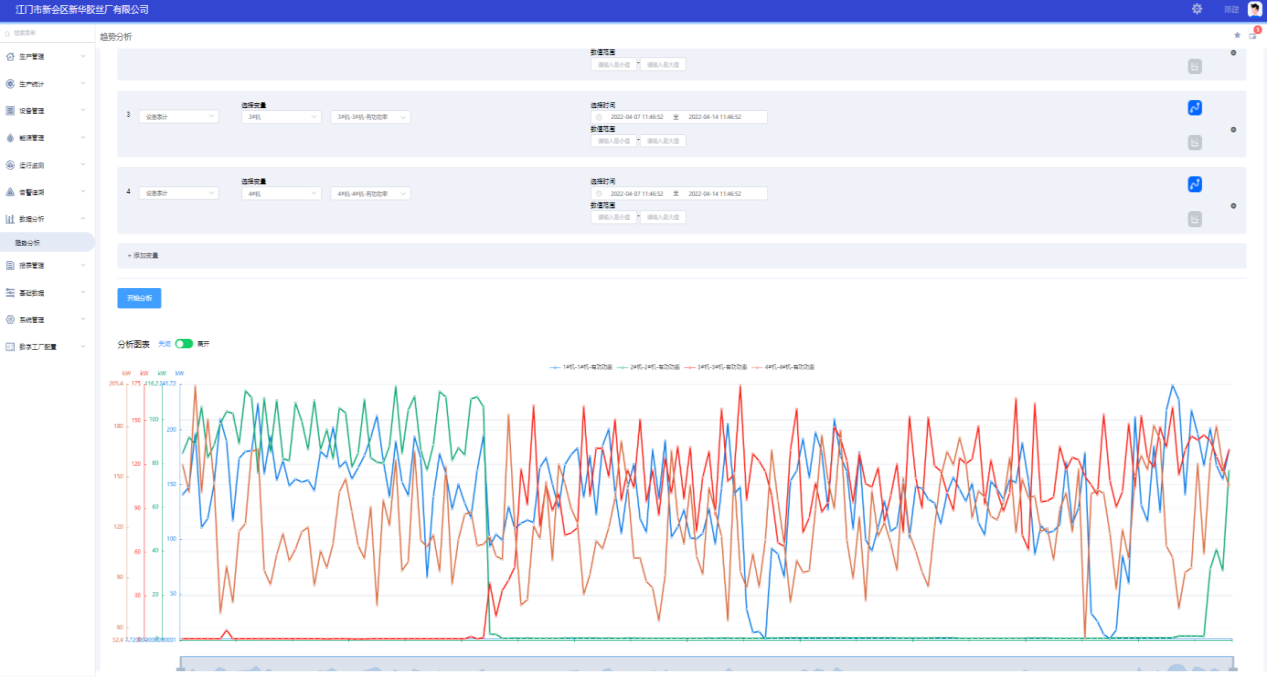 新華膠絲廠能效分析具有強大的歷史能耗數(shù)據追溯和分析功能,多維度分析企業(yè)不同生產區(qū)域/設備的能耗、能效水平及產量,可隨時查看某個區(qū)域/設備、時間、班組的能耗、能效、產量波動情況,通過動態(tài)的圖形顯示,快速了解是否有異常情況,從而對生產、管理、工藝及時進行指導和調整,使新華膠絲廠生產過程的單位能耗和能源效率保持在科學、合理水平。
