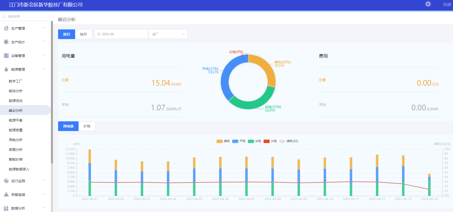 新華膠絲廠生產用電峰谷平數(shù)據在線監(jiān)測,反映企業(yè)錯峰用電實際狀況、錯峰用電占比情況。對企業(yè)歷史用電量及電費(錄入)進行統(tǒng)計分析,有助于合理調度高耗能設備啟停區(qū)間,減少峰電比例,節(jié)約生產能源成本。展示各廠峰谷用電的實物量及占比,通過峰谷平用電比例指導車間及工序合理排產,提高用電的效率和經濟性。