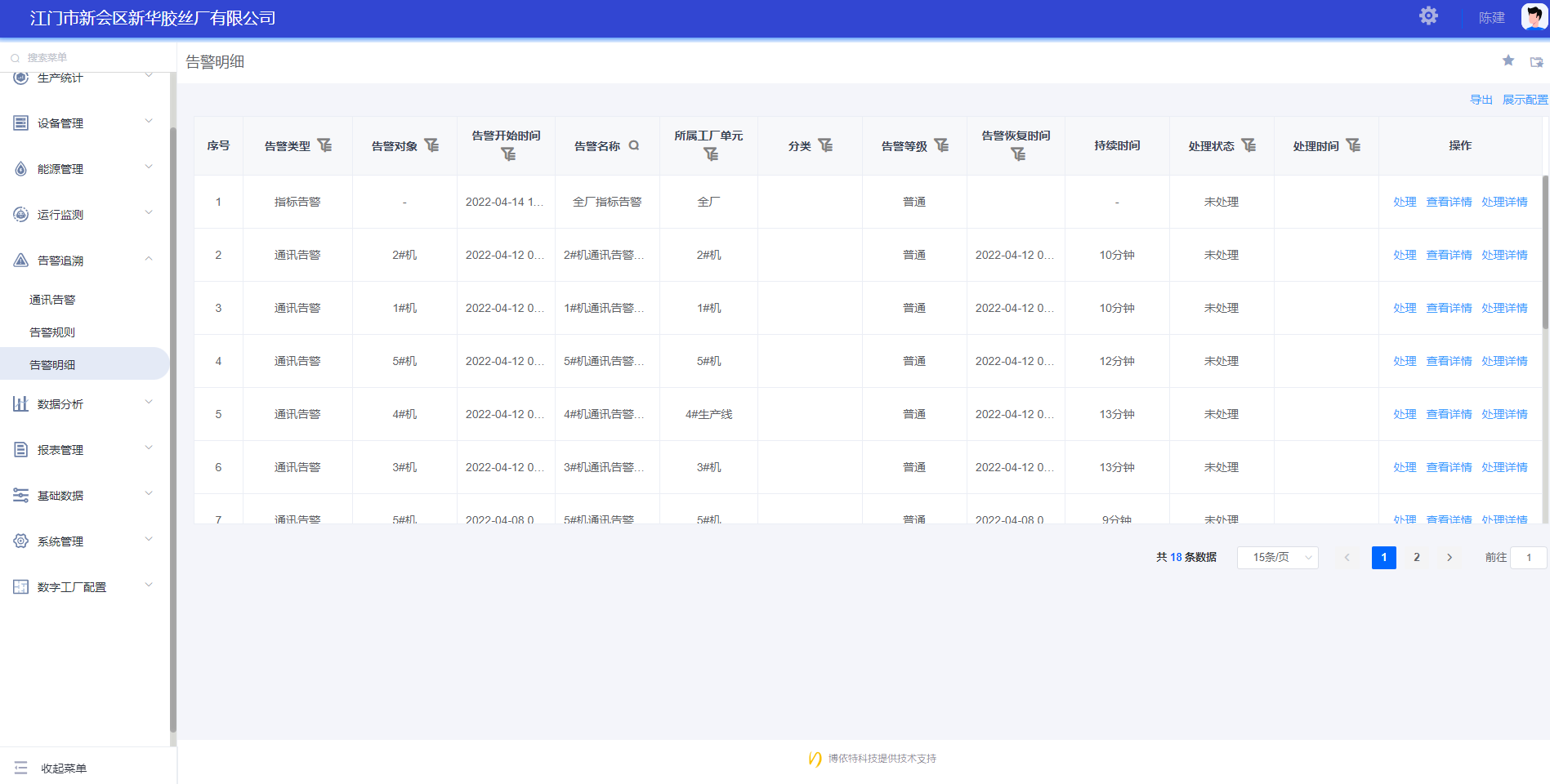 告警追溯模塊實現(xiàn)設備運行異常、能耗異常等生產異常實時告警與追溯。所有報警變量及其上、下限新華膠絲廠可以自定義,當發(fā)生異常時,對應的工段或者設備以閃爍、改變顏色或發(fā)短信等告警形式提醒相關人員。告警晴雨表以廠區(qū)拓撲圖(工廠模型)的形式直觀展示,告警類型包括通訊告警、指標告警、參數(shù)告警。