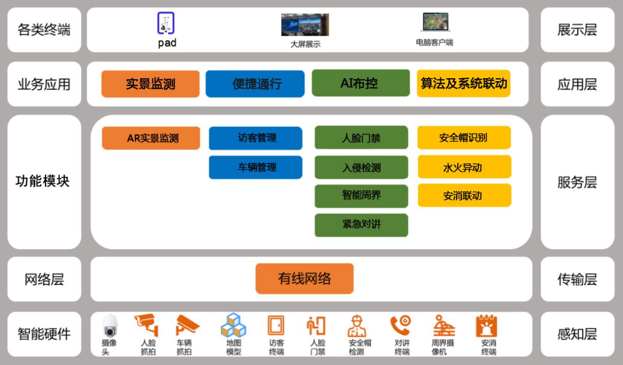 感知層:系統(tǒng)前端感知設備包含AR攝像頭、普通監(jiān)控攝像頭,人臉識別攝像機、車牌攝像機、周界防范攝像機、明火檢測攝像機等告警終端/系統(tǒng)。