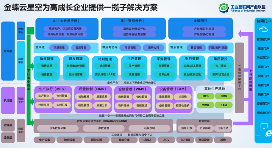 金蝶云·星空高成長工業互聯網解決方案依托國家級“雙跨”平臺之一的金蝶星域工業互聯網平臺,聚焦高成長型企業,是目前國內唯一一款PLM+ERP+MES一體化解決方案。金蝶云·星空堅持“企業對發展期望就是我們的奮斗目標”的價值觀,和高成長企業一起共創了在數字經濟下新的工業互聯網解決方案,幫助中小企業進行“數字化轉型”能力建設:在傳統的企業經營管理的基礎上,拓展了解決新產品研發的PLM,解決柔性制造的MES系統,實現供應鏈的全渠道、供應商協同等解決方案,幫助中小企業用數字化工具實現內部的全數字化覆蓋。