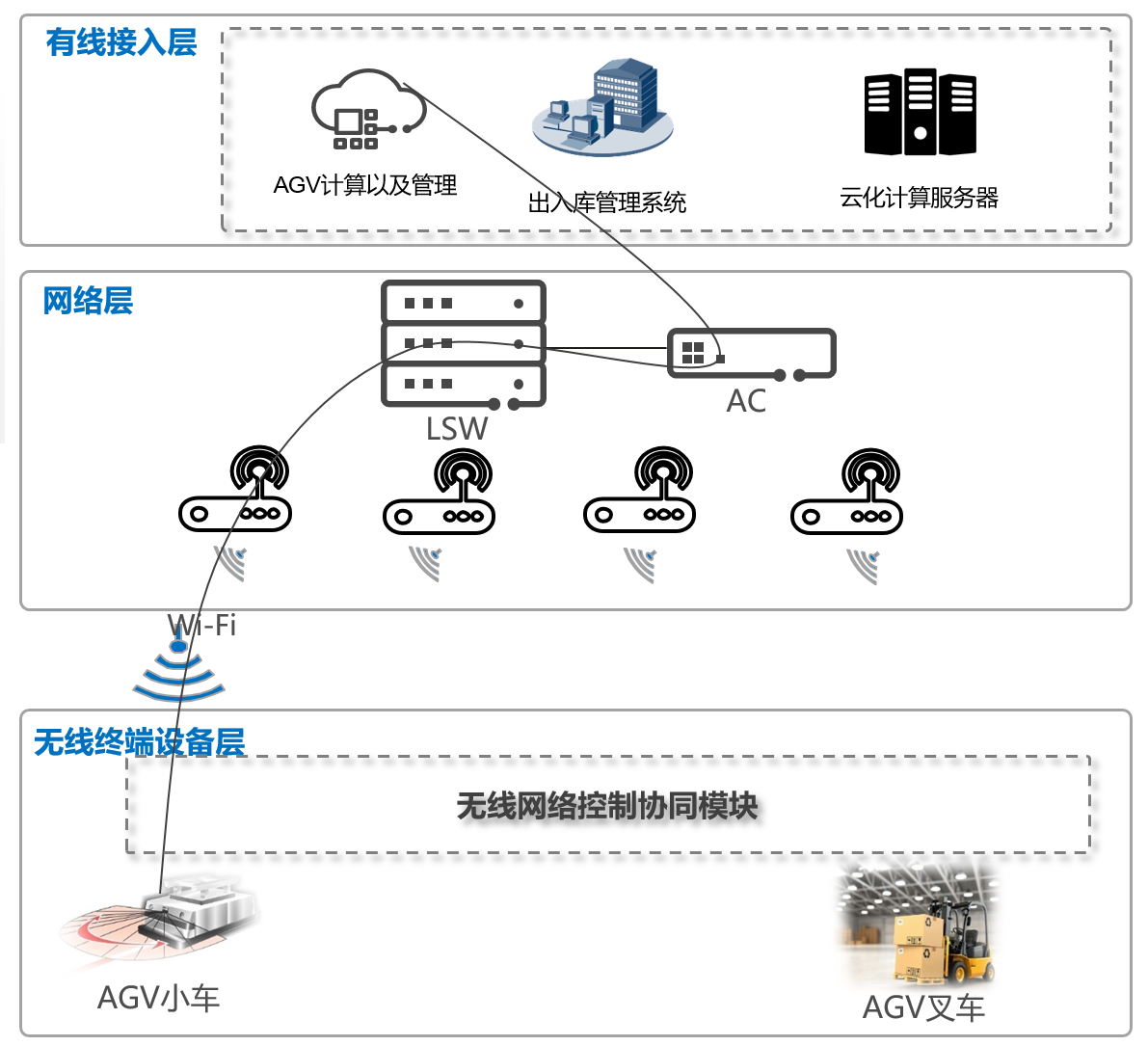 物流行業(yè)需求快速發(fā)展的同時,自動機器人控制、調度對WLAN通信實時性、可靠性、并發(fā)能力提出了前所未有的要求。而針對傳統(tǒng)上網(wǎng)或人工倉儲應用的現(xiàn)有網(wǎng)絡難以滿足特性和規(guī)格要求,為WLAN自動倉儲應用方案帶來新的機遇和挑戰(zhàn)。本方案采用Wi-Fi 6技術與AGV技術結合,解決了無人倉高性價比、多機高并發(fā)、低時延、高可靠無線通信的要求。未來還可以擴展至工業(yè)環(huán)境其他的AGV場景。